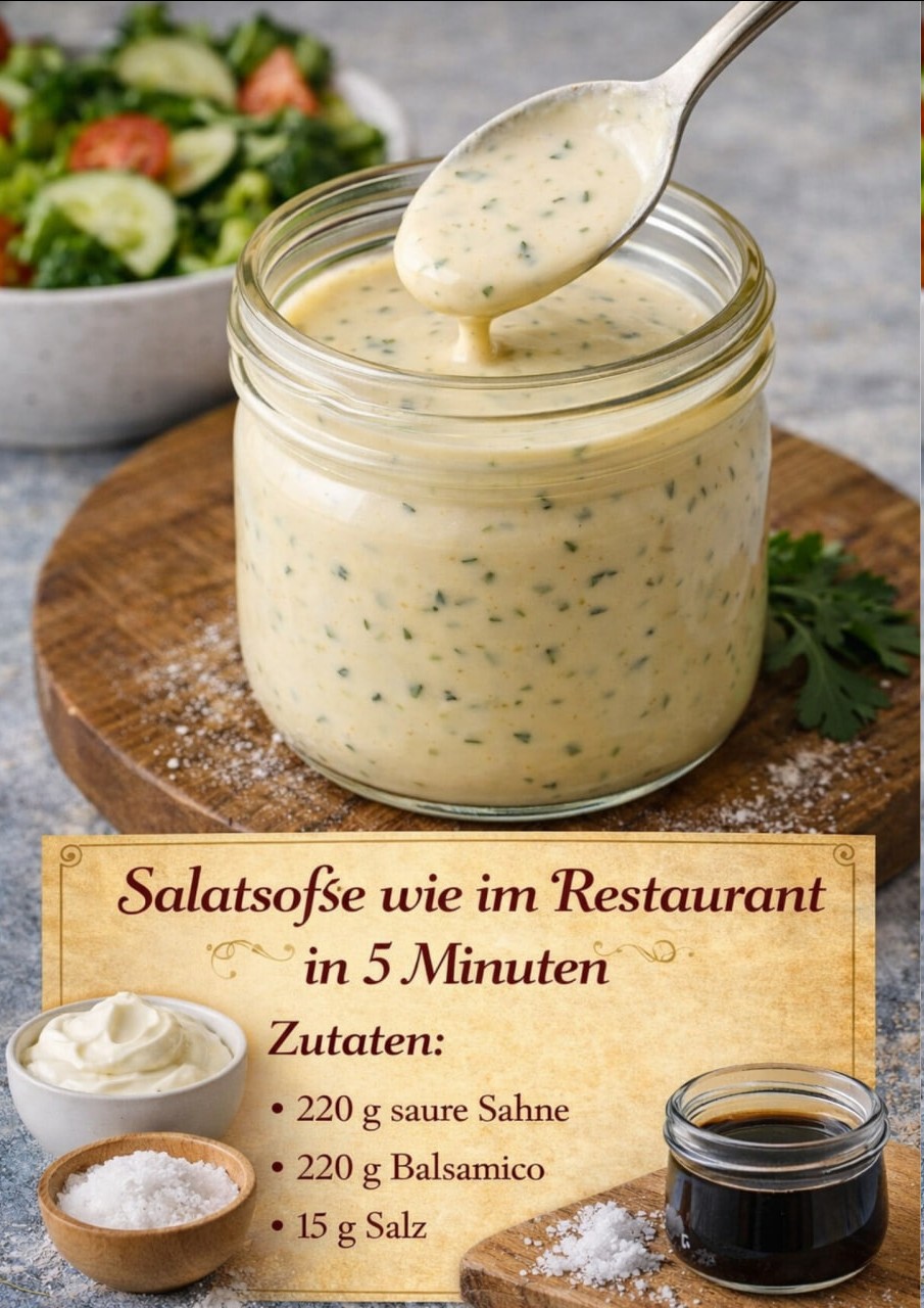 Zutaten: 200 g Öl 200 g weißer Balsamicoessig 200 ml Gemüsebrühe 50 g Zucker 20 g Salz ½ TL Pfeffer 200 g Saure Sahne (alternativ: Schmand) 200 g Naturjoghurt 60 g Senf (mittelscharf) 1 TL getrocknete Salatkräuter (z.B. Italienische Kräuter) Zubereitung Fortsetzung auf der nächsten Seite 👇(Seite 2)👇
